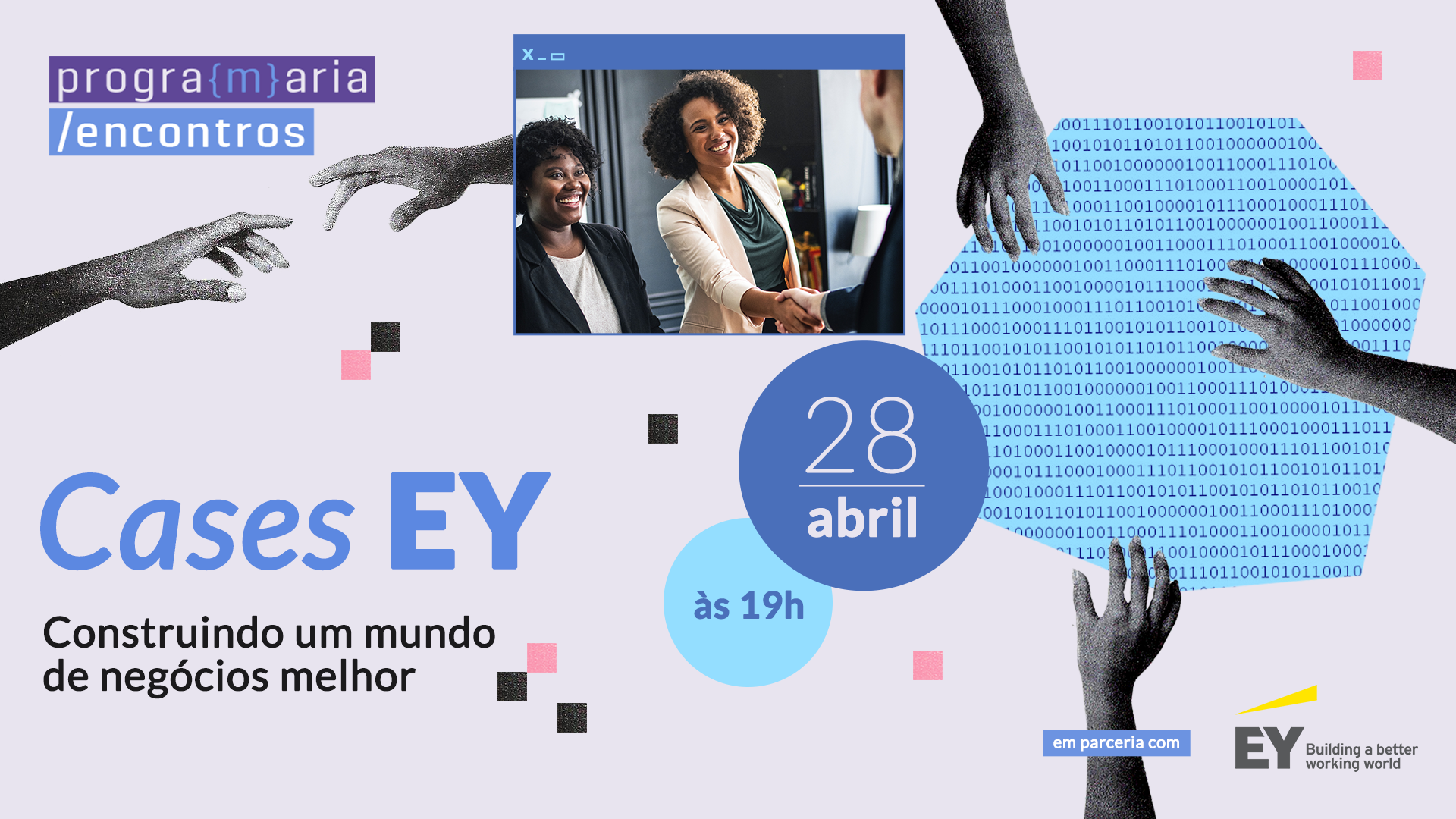 O PrograMaria Encontros de maio será em parceria com a EY, uma das maiores empresas de serviços de auditoria e consultoria do mundo, e trará mulheres na liderança de suas áreas para compartilharem seus conhecimentos e como ajudam a construir um mundo de negócios melhor, lema da EY.